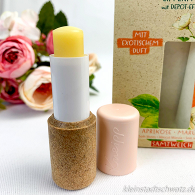 Die vegane Lippenpflege Samtweich mit exotischem Duft enthält Aprikosenkern- und Marulaöl. Diese sorgen für den fruchtigen Duft und zart gepflegte Lippen.