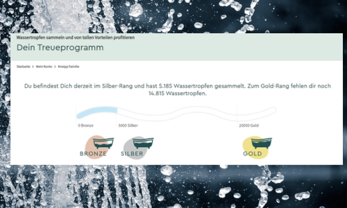 Als Mitglied der Kneipp® Familie sammelt ihr nun bei jedem Einkauf zusätzlich Wassertropfen (100 Tropfen pro €), die eurem Kundenkonto im Treueprogramm gutgeschrieben werden. Hier kann je nach Anzahl Bronze, Silber oder Gold Status erreicht werden, welche verschiedene Vorteile mit sich bringen. Bronzestatus erhält man mit gesammelten 0 – 4999 Tropfen, Silber ab 5000 Tropfen und Goldstatus ab 20000 Tropfen. Die 5% Einkaufsrabatt bekommt ihr auch weiterhin bei euren Einkäufen. Gesammelte Wassertropfen und Status sind 365 Tage gültig.