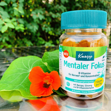 Die Kneipp® Gummis Mentaler Fokus unterstützen Nerven und Konzentration. Der enthaltende Vitamin B-Komplex (Vitamine B1, B2, B6 und B12) kann zu einer normalen Funktion des Nervensystems, zur Verringerung von Müdigkeit und zur normalen psychischen Funktion beitragen.