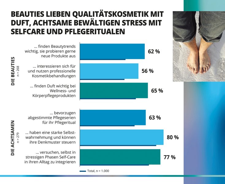 Steht die Fußpflege hoch im Kurs, greifen Menschen mehr zu speziellen Produkten oder gönnen sich professionelle Fußpflege. So benutzen zum Beispiel rund 70 % der Schönheits- und Pflegebewussten regelmäßig Cremes oder Lotionen für ihre Füße im Vergleich zu den Durchschnittsdeutschen mit 62 %. Diese Gruppen bauen auch häufiger auf Produkte mit speziellen Wirkstoffen, die ihre Pflegeziele unterstützen. Bei der Auswahl der Fußpflegeprodukte geht es den meisten Menschen um eine hohe Qualität der Inhaltsstoffe und ein gutes Qualitätsmanagement. Beides muss für die große Mehrheit (81 %) stimmen, noch häufiger (84 %) aber wünschen sich das Menschen, die Fußpflege auch für wichtig halten. Eine hohe Produktqualität schätzen zwar auch Menschen, die der Fußpflege keine besondere Bedeutung beimesse. Sie tun dies aber deutlich seltener (59 %). Dafür muss sie ein Produkt häufiger optisch ansprechen, sonst kaufen sie es nicht. Vor allem selbstachtsame Pflegeaffine und risikobewusste Vorbeuger achten neben der Qualität zusätzlich auf Inhaltsstoffe aus der Natur. Aber auch Wellness und sinnliche Pflegeerlebnisse dürfen nicht zu kurz kommen. Rund zwei Drittel der jungen Leute und pflegeaffinen Beautys runden ihre Pflegerituale gern mit einem schönen Duft oder mit einer abgestimmten Pflegeserie ab.