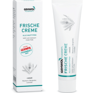 Die GEHWOL FUSSKRAFT Frische Creme (ehemals Mint) mit Minzöl und Menthol belebt schmerzende Füße. Die leichte, gelartige Konsistenz fettet nicht und zieht sofort ein. Die Creme kühlt und vitalisiert müde Füße. Zudem wird Fußgeruch vorgebeugt. Aloe vera und Urea spenden Feuchtigkeit, während natürliche ätherische Öle aus Rosmarin, Bergkiefer und Lavendel beleben und der Frische Creme ihren charakteristischen Duft verleihen. Desinfizierende Wirkstoffe schützen zuverlässig vor Fußpilz und Juckreiz – auch zwischen den Zehen.